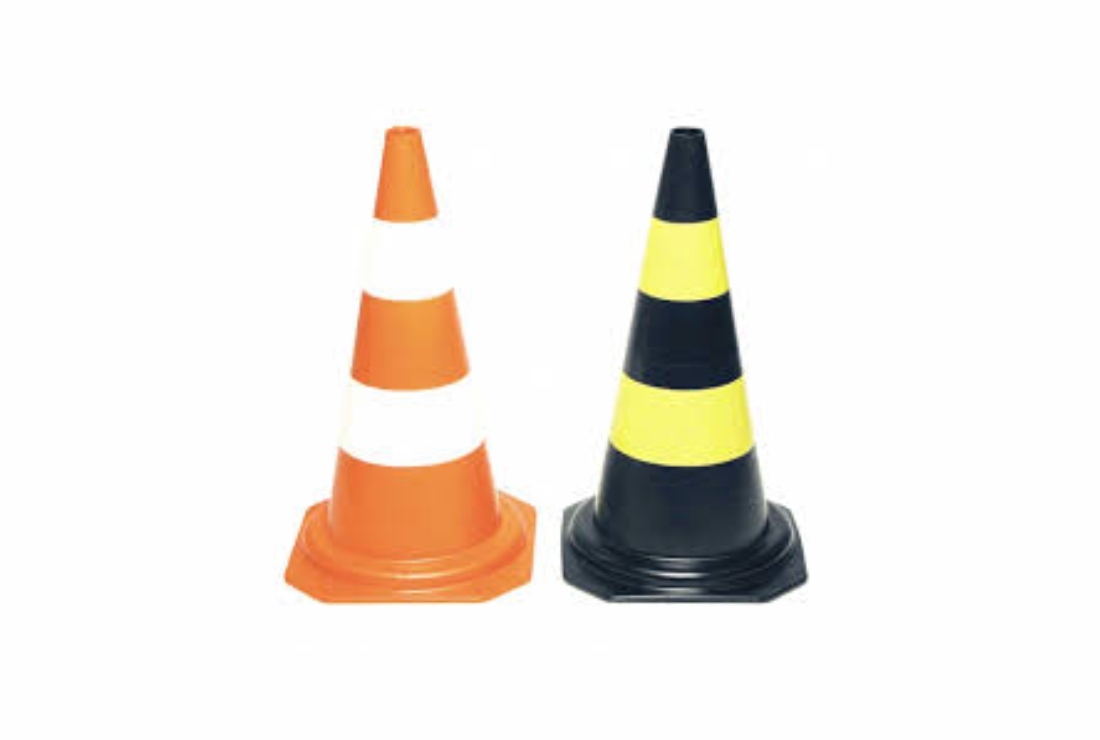 Confeccionados em material plástico semi-rígido, nas cores amarelo/preto e laranja/branco.