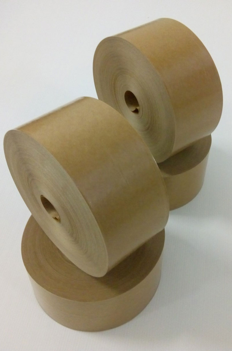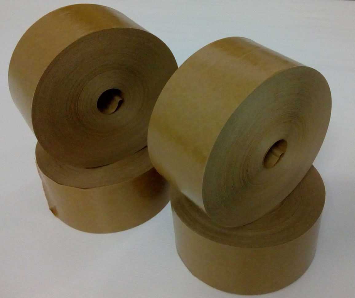 Fita de papel Kraft natural c/ ou s/ reforço de fio sintético. Pode receber impressão em várias cores que serve como identificação e propaganda do produto inibindo a violação da embalagem.